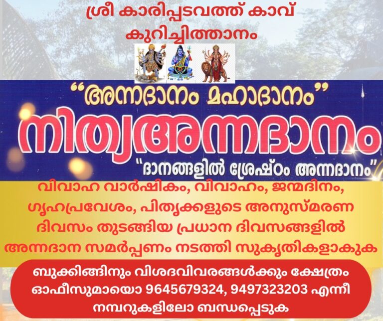 Karippadavathu Kavu, located in Kurichithanam, Kerala, India, is a sacred abode that resonates with divine energy and spiritual significance. This revered temple is dedicated to Goddess Bhagavathy, a manifestation of the divine feminine, and stands as a testament to the rich cultural and religious heritage of Kerala.